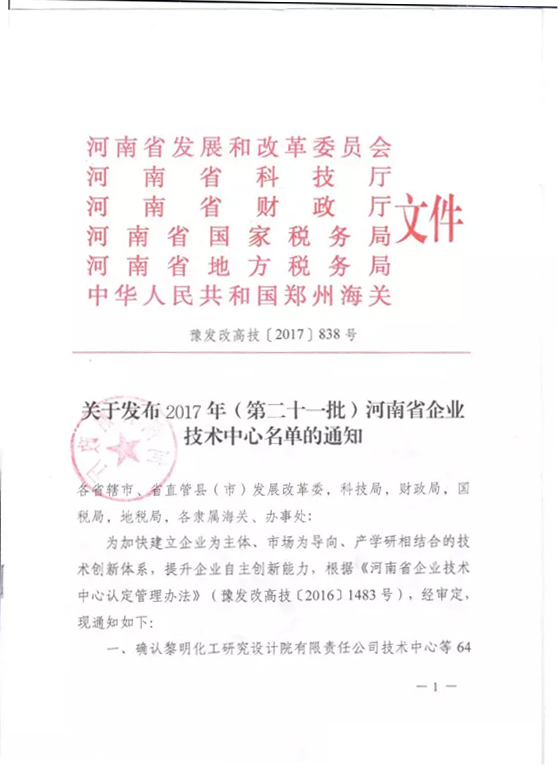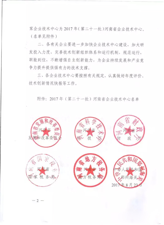 我公司2017年向发改委申报河南省企业技术中心,于2017年8月23日由河南省发改委、科技厅、财政厅、国